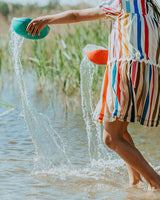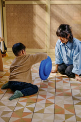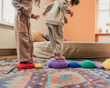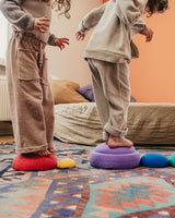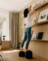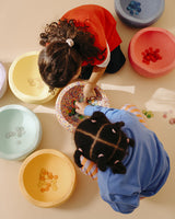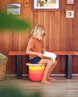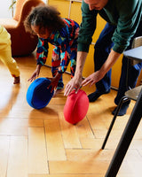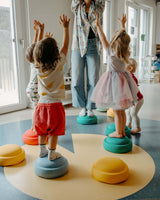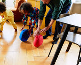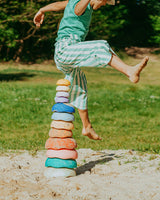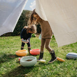 Free play and free movement development are the two main pillars of the pedagogically valuable Pikler philosophy, on which we strongly orient ourselves. Therefore, there are no set instructions. Even the youngest children are invited to try out movement and to have all kinds of experiences with their own bodies in free play. This includes, for example, climbing on the Stapelstein® Original, sitting in the bowl and spinning, holding up the Stapelstein® elements, knocking them over, building new play worlds, turning them over, filling them, carrying them around, and much more.